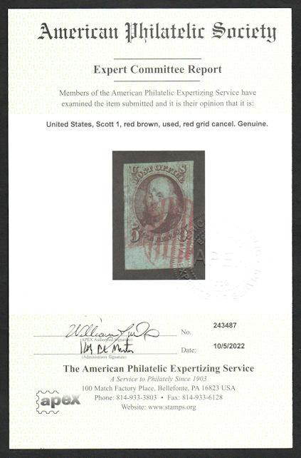# 1 F-VF, w/APS (10/22) CERT, large sheet margin at bottom, red grid cancels, rich color, very nice!