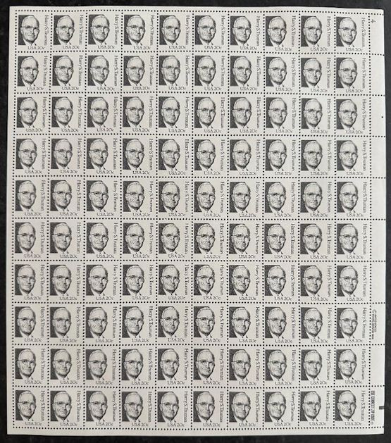 #1862b F-VF OG NH, 20c Harry S. Truman Full Sheet, Plate Number 4, bold color!