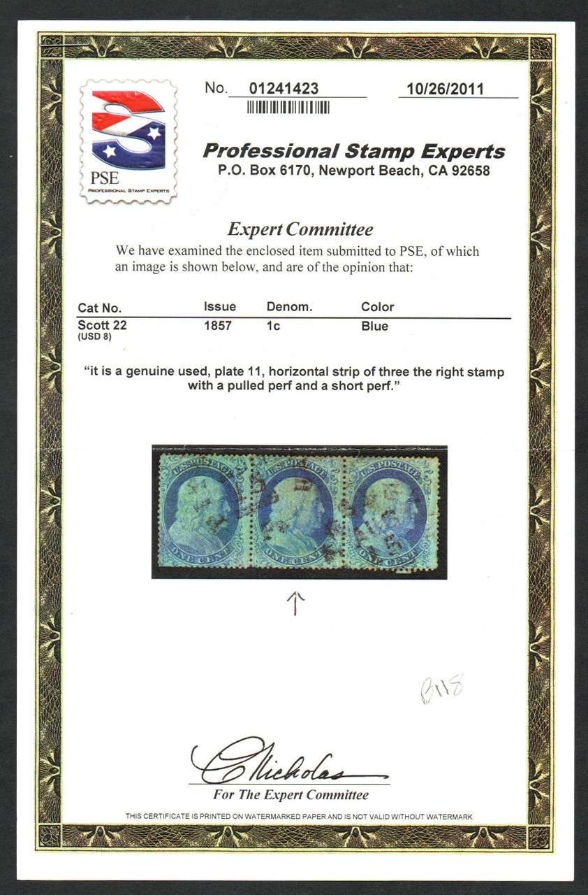 # 22 VF/XF for issue, w/PSE (10/11) CERT, a well balanced stamp, you do not see many number 22's centered this well, CHOICE!