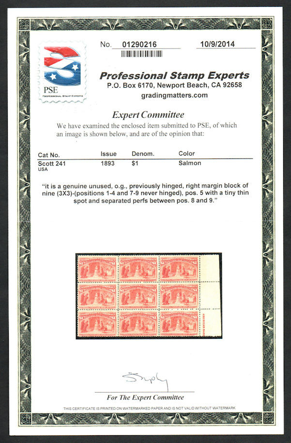 - # 241 Fine+ OG NH , w/PSE (10/14) CERT, all never hinged $1-$5 Columbians should have a certificate stating that they are NH, regummed or altered stamps known, CHOICE!