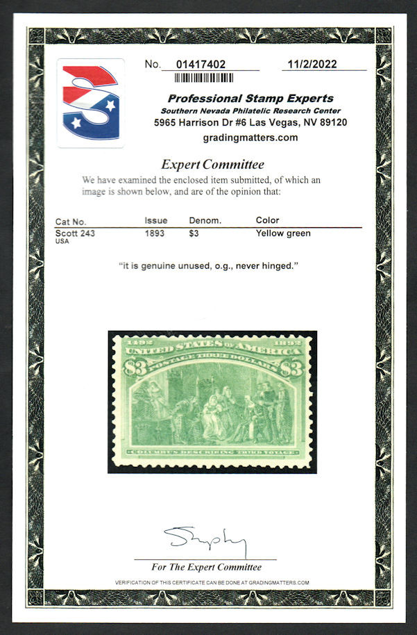 - # 243 Fine+ OG NH, w/PSE (11/22) CERT, a truly never hinged stamp with terrific color, all $1-$5 Columbians should have a certificate stating that they are NH, regummed or altered stamps known, Choice!