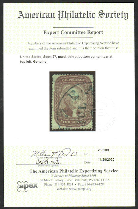 - # 27 F/VF, w/APS (11/20) CERT, za well centered stamp in brick red, small thin and tear, nice price