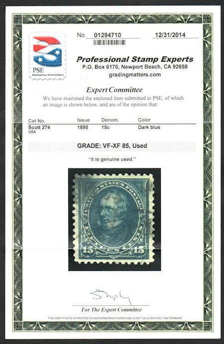 - # 274 VF/XF, w/PSE (GRADED 85 (12/14)) CERT, cork cancel, nicely centered, SELECT!