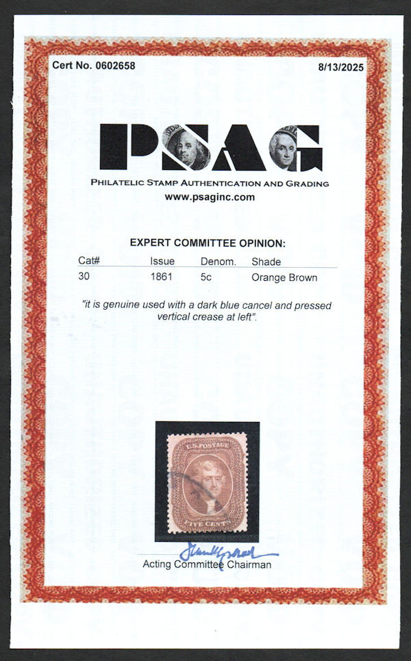 # 30 F/VF, w/PSAG (08/25) CERT, a choice used stamp with neat town cancel, an amazing stamp, with strong color, lite crease, SUPER NICE!