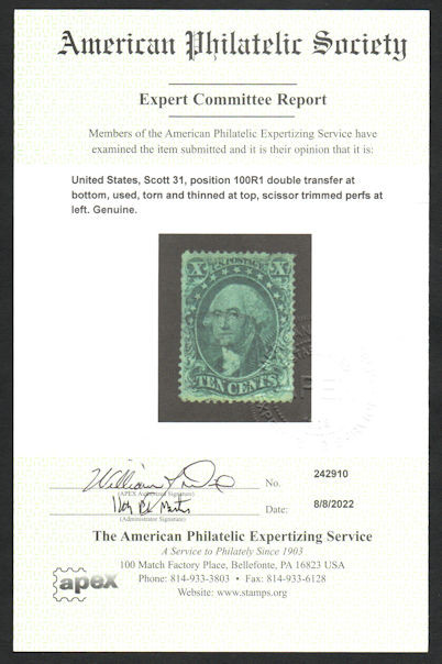 - # 31 VF/XF, w/APS (08/22) CERT, very faint cancel, Pos. 100R1, a super looking stamp with flaws, nicely centered, CHOICE!