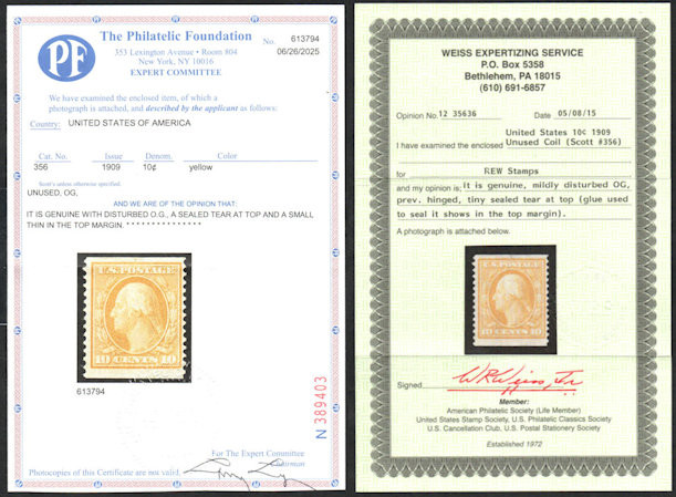 # 356 VF OG H, w/PF (06/25) and WEISS (05/15) CERT, well centered, small sealed tear/thin, Do not buy any 356's without a certificate, highly counterfeited coil, Nice!