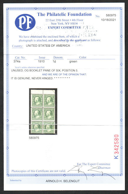 # 374a F-VF OG NH, w/PF (10/21) CERT, Booklet Pane, Pos. 5, post office fresh!