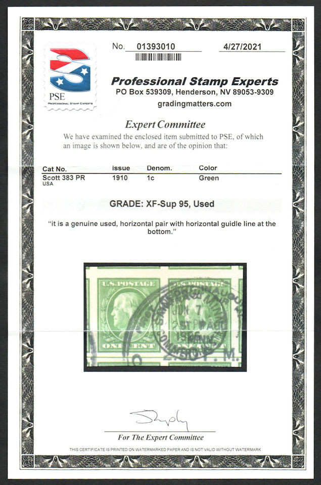 # 383 XF-SUPERB, Pair w/ guide line at bottom, w/PSE (GRADED 95 (04/21)) CERT, town cancel, robust color, SELECT!