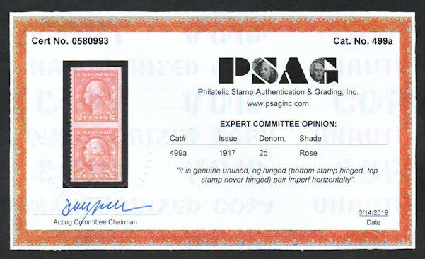 # 499a F/VF OG NH/H, Imperf Horz, w/PSAG (03/19) CERT, a very rare imperf pair, the catalog does not do justice to this one, beware of pairs offered without certificates, many fake and blind perforation pairs exist, RARE!