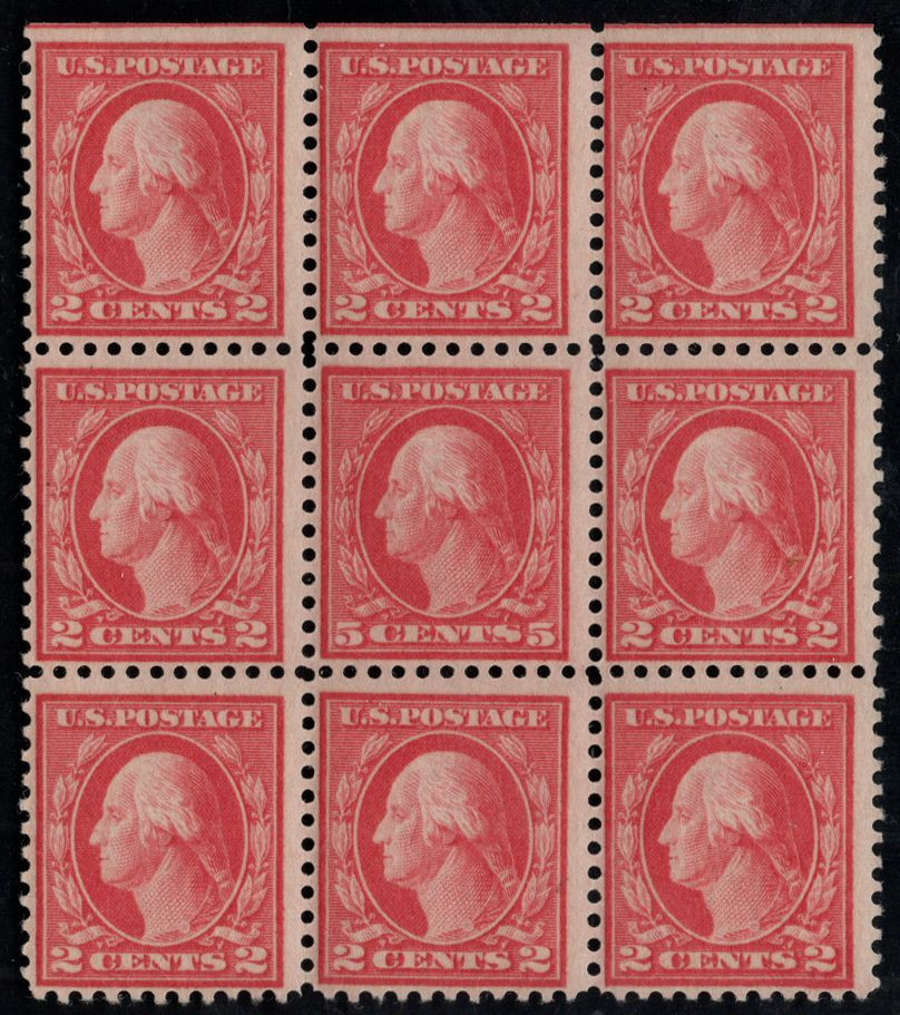 - # 505 F/VF OG NH, single error stamp in a block of 9, usual straight at top as this is the only way they comes, Fresh!