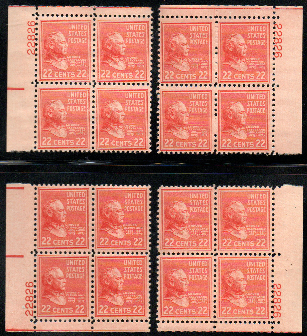 # 827 F/VF to VF OG NH, 22826, Matched Set of 4 plate blocks, fresh