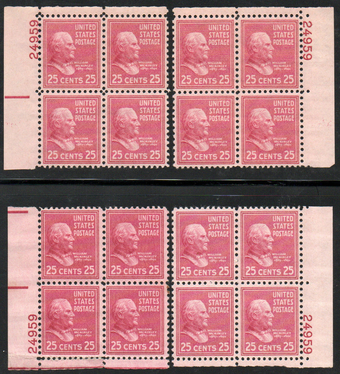 # 829 F/VF to VF OG NH, 24959, Matched Set of 4 plate blocks, fresh
