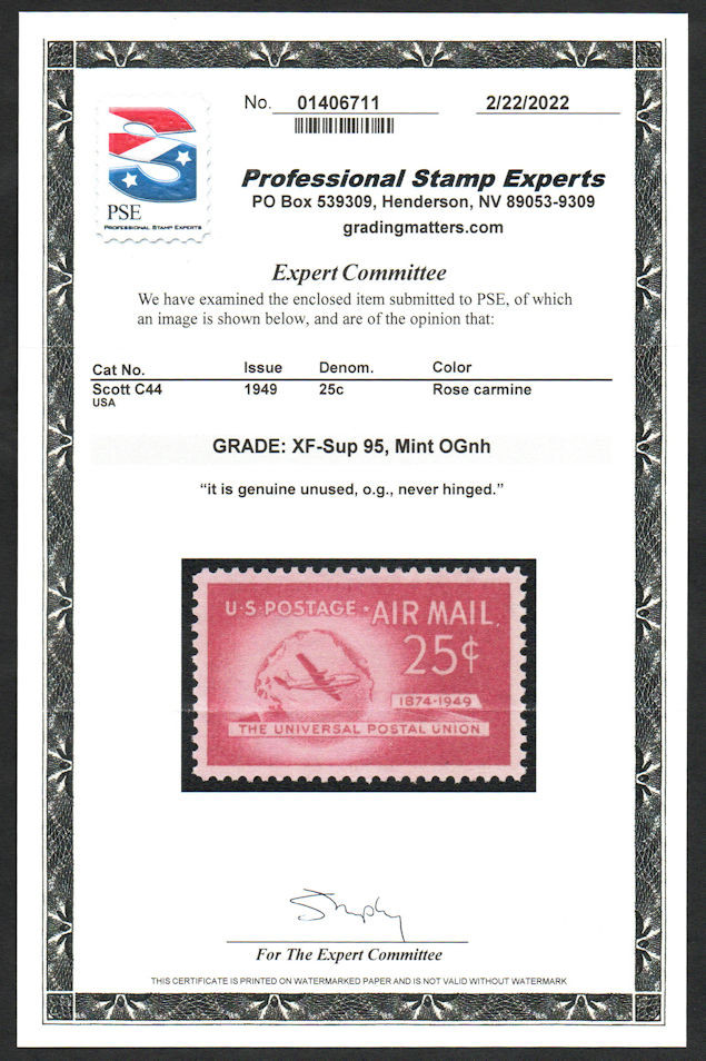 Click the button below to add the #C 44 XF-SUPERB OG NH, w/PSE (GRADED 95 (02/22)) CERT, spectacular color, GEM! to your wish list.
