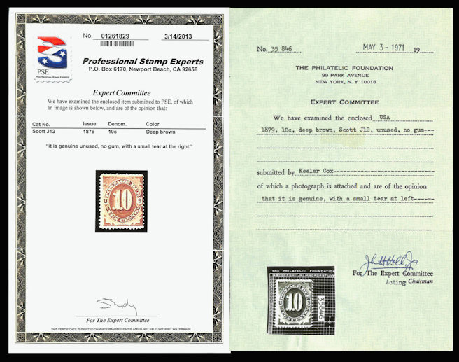 - #J 12 F/VF mint NGAI, w/PSE (03/13) and PF (05/71) CERTS, only 174 sold, terrific color and complete perforations all around (seldom seen on the re-issues), tiny perf tear, Do not purchase any J8 - J14 without cortication, SUPER STAMP!