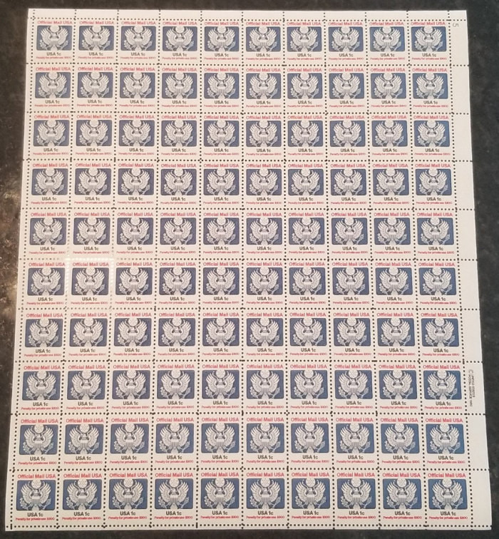 #O127 1c Official, Sheet of 100, VF OG NH, *STOCK PHOTO - same quality as pictured sheet *