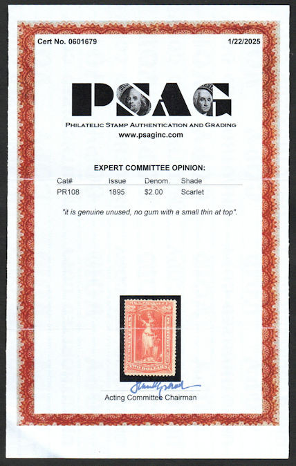 #PR108 Fine+ mint ng, w/PSAG (01/24) CERT, fresh color, small thin, Rare Stamp!
